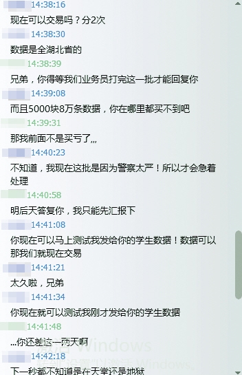 近日,記者發(fā)現(xiàn),仍有大量“信息販子”活躍在QQ群內(nèi),記者與群內(nèi)成員簡(jiǎn)單交流后便成功買到準(zhǔn)大學(xué)生詳細(xì)個(gè)人信息,個(gè)人信息甚至父母信息一應(yīng)俱全,3毛/條,打包價(jià)1萬元/10萬條。經(jīng)記者核實(shí),信息準(zhǔn)確度較高。而“信息販子”自稱數(shù)據(jù)信息是“入侵教育局”而來,“一次提取數(shù)萬條數(shù)據(jù)信息后,轉(zhuǎn)手能賣幾萬元”。而“信息販子”往往不會(huì)過問購買者所做何用。