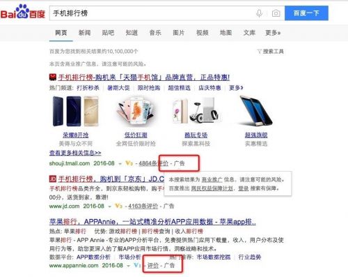 作為受影響最大的百度搜索,TechWeb查詢(xún)發(fā)現(xiàn),目前百度的搜索結(jié)果頁(yè)面的廣告樣式已經(jīng)由原來(lái)的“商業(yè)推廣”變成“廣告”二字描述了。